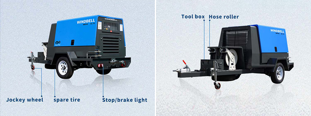 Pre-filter system and internal aftercooler make sure the compressor can wokr in very hard conditions ,such as rock drilling ,mining , sandblasting , concrete breaking.